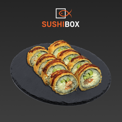 Копченая курица, творожный сыр, огурцы, крабовые палочки, соус унаги