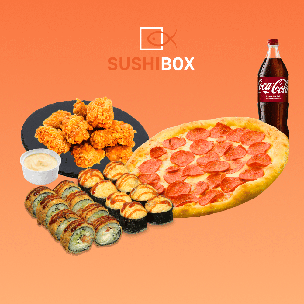 запченный ролл "кабуки", жареный ролл "темпура лосось", крылышки 6 шт (соус сырный)