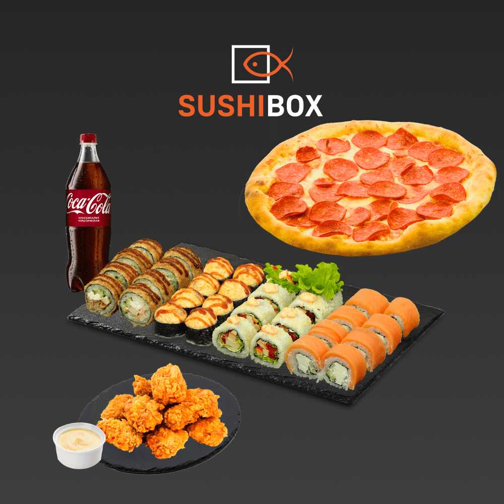 пицца "Пепперони", запеченный ролл "Кабуки, жареный ролл "Фудзияма", ролл "Филадельфия", ролл "Цезарь спайси", Крылышки 15 шт, (соус на выбор, напиток на выбор)