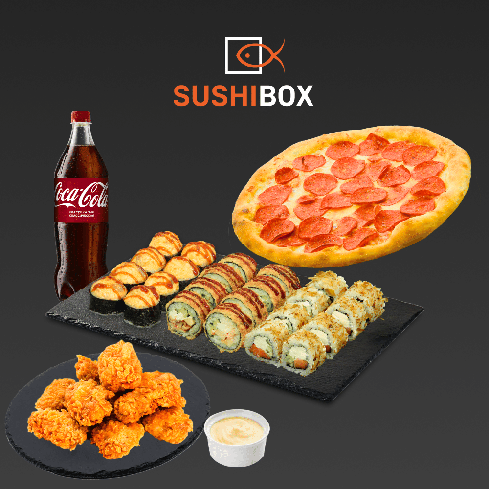 пицца Пепперони, Кабуки, Фудзияма, Банзай, Крылышки 9 шт, напиток и соус на выбор